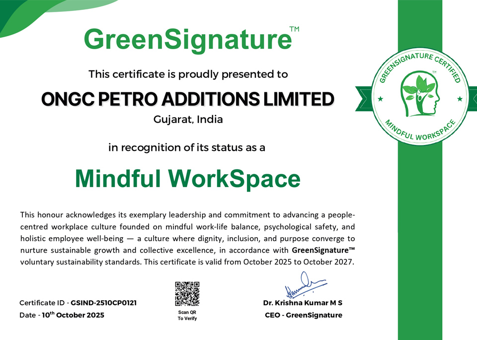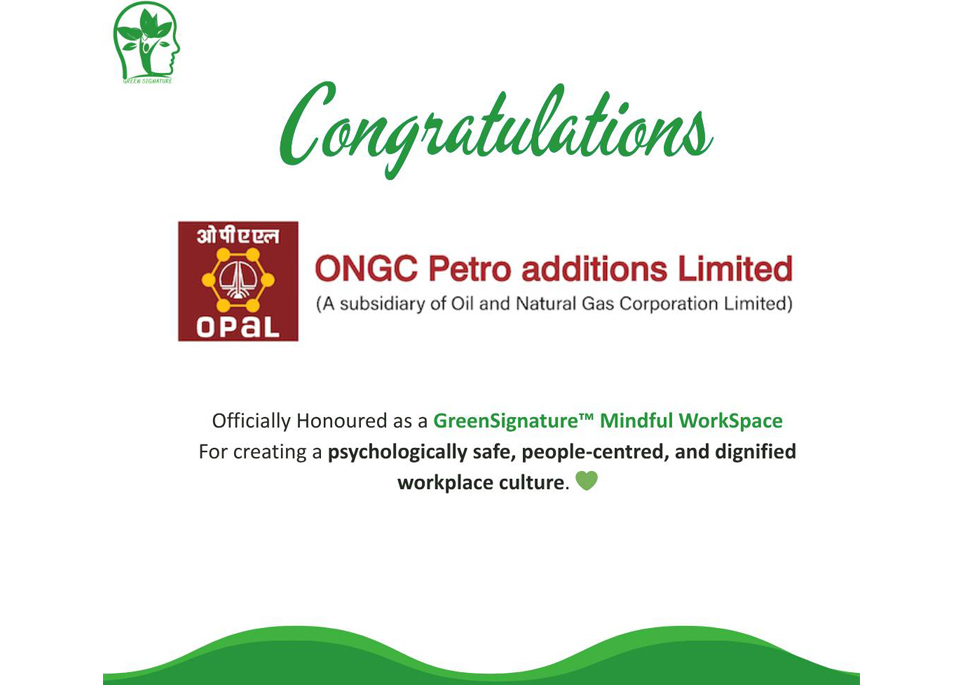 We are proud to share that OPaL has been officially recognised as a “Mindful WorkSpace” by GreenSignature™, a prestigious honour that reaffirms our unwavering commitment to employee well-being and a thriving, people-first workplace culture.